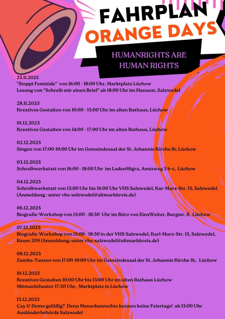 Gemeinsam gegen patriarchale Gewalt Feministische Solidarität, im Wendland und der Altmark. Über Grenzen hinweg. Lokal und global: Wir stehen zusammen gegen Gewalt an Frauen und TINA+ (Trans, Inter, Nichtbinäre Personen und A-Gender). In Salzwedel und Lüchow finden im Rahmen der Orange Days vom 25.11. – 10.12.2025 zahlreiche Veranstaltungen statt – sichtbar, laut, leise, kreativ, nachdenklich, stärkend und solidarisch. In vielfältigen, klugen, kritischen, wütenden und lustigen Angeboten wollen wir gemeinsam klare Zeichen für Selbstbestimmung, Schutz und Gerechtigkeit setzen: Biografie-Workshops, Lesungen, Kreatives Gestalten, Schreibwerkstätten, Zumba-Tanzen, Singen, Mitmach-Theater. Eine Kooperation vom Frauenhaus Lüchow, der Frauen und Mädchenberatungsstelle im Wendland und EinsWeiter e.V. Kommt vorbei, macht mit, seid sichtbar gegen Gewalt – für ein solidarisches Miteinander!
